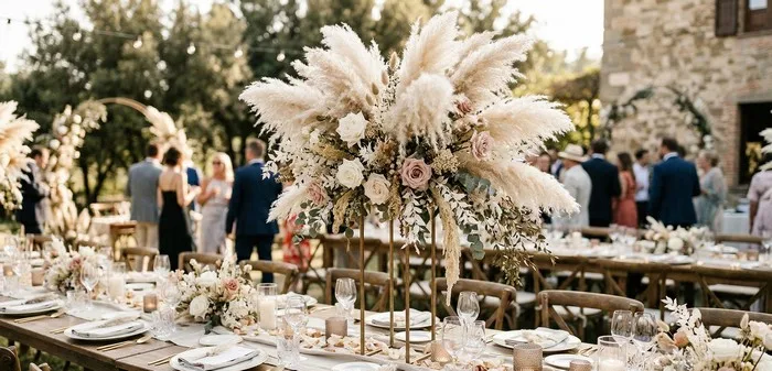 בעת בניית עיצוב שולחנות לאירועים, אנו שמים דגש על משחקי טקסטורות. הפמפס מביא איתו רכות נוצתית, בעוד שעלי דקל מיובשים או ענפי אקליפטוס משומרים מוסיפים מבנה וצורה. השילוב ביניהם יוצר עומק שמושך את העין וגורם לכל שולחן להיראות כמו יצירת אמנות.