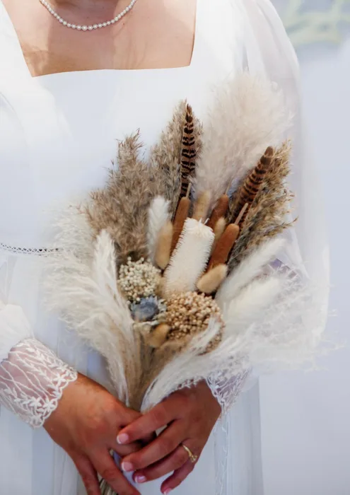 זר כלה טבעי המורכב מצמחים מיובשים ומשומרים באיכות הגבוהה ביותר, שנבחרו בקפידה אחד אחד.