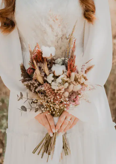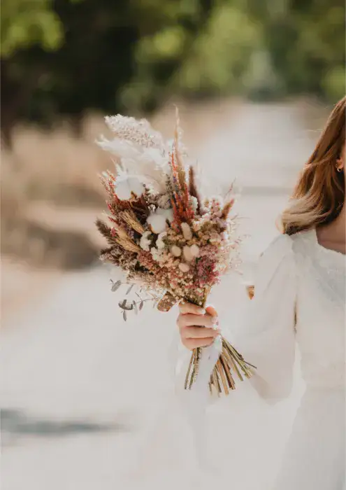 זר כלה טבעי המורכב מצמחים מיובשים ומשומרים באיכות הגבוהה ביותר, שנבחרו בקפידה אחד אחד.