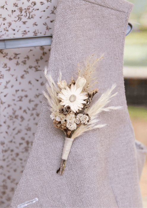 תכשיט אלגנטי לחליפה, המעוצב בעבודת יד מפרחים מיובשים/משומרים באיכות הגבוהה ביותר.