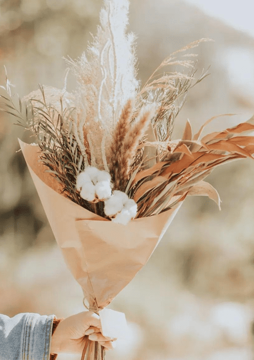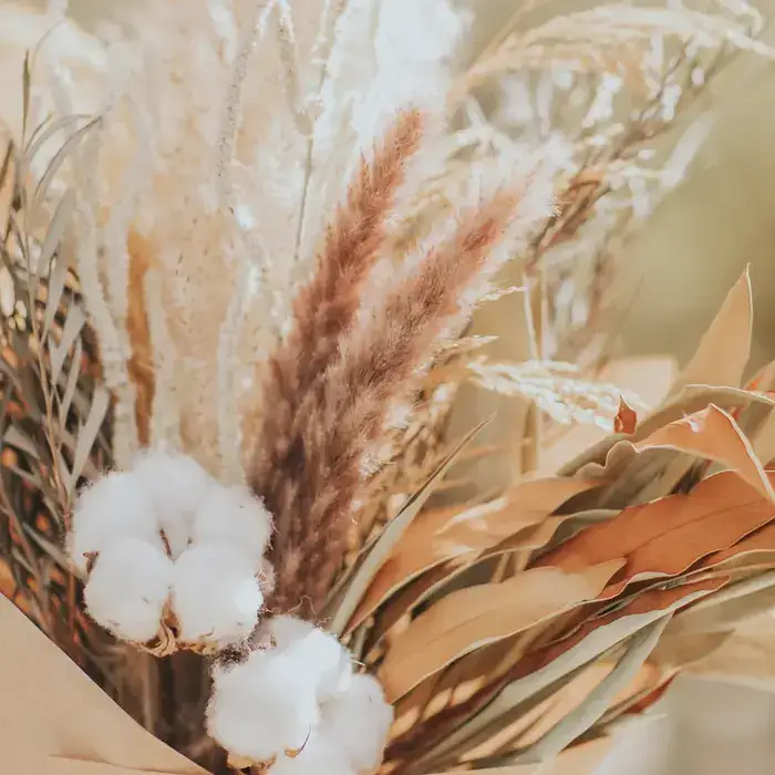 בשילוב פריחת הכותנה, עלים מוזהבים וירוקים, פמפס ועוד