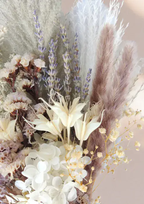 בשילוב לבנדר ריחני, פרחי ניג'לה מולבנים, פריחת הורטנזיה, מגוון סוגי פמפס,