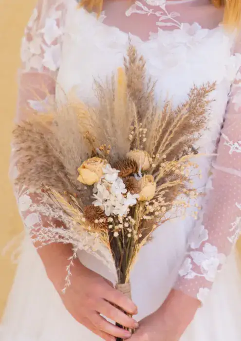 זר כלה טבעי המורכב מצמחים מיובשים ומשומרים באיכות הגבוהה ביותר, שנבחרו בקפידה אחד אחד.
