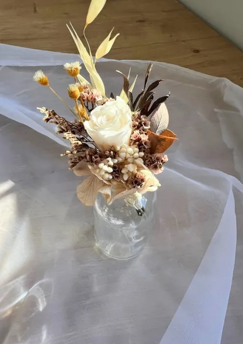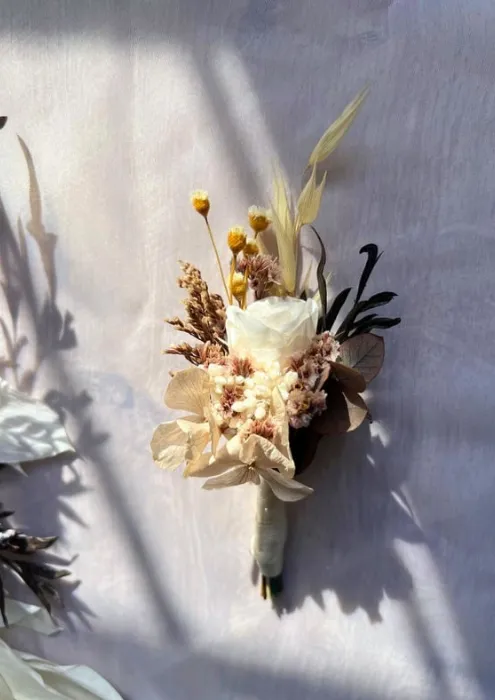 תכשיט אלגנטי לחליפה, המעוצב בעבודת יד מפרחים מיובשים/משומרים באיכות הגבוהה ביותר.