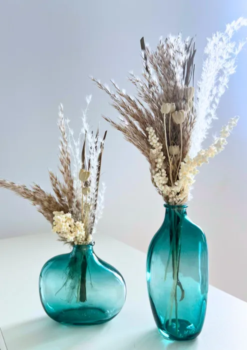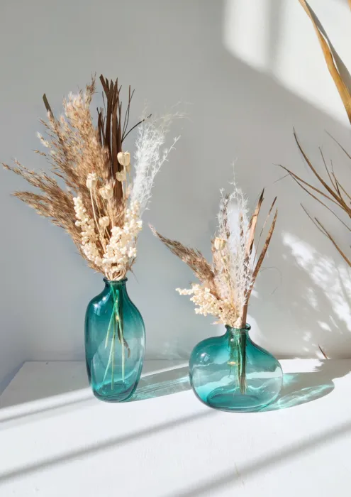אגרטלי זכוכית בגוון טורקיז, עם זר ממגוון פמפסים ופרחים נוספים .