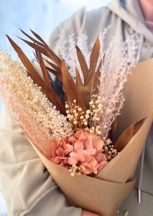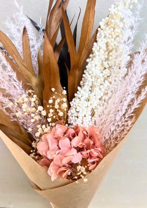 זר השזור בכד חרס בשילוב פריחת ההורטנזיה, עלים מוזהבים, פמפס ורדרד, דורה וגיבסנית,