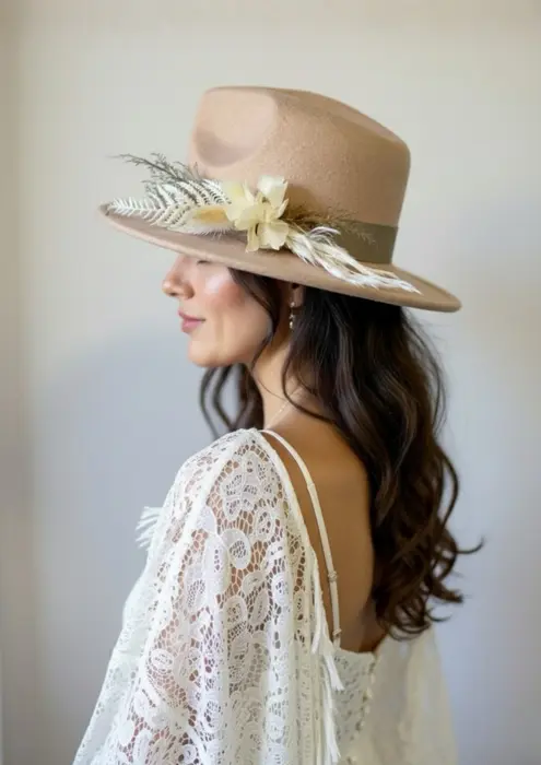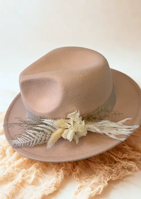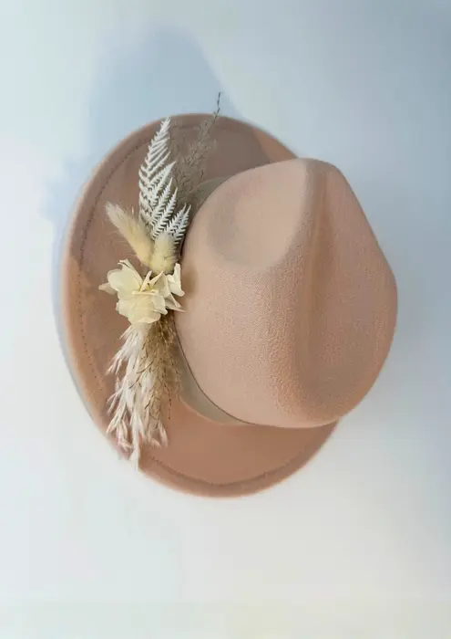 כובע בסגנון בוהו שיק עשוי זמש בהיר, ששזור בפרחים מיובשים טבעיים בעבודת יד.