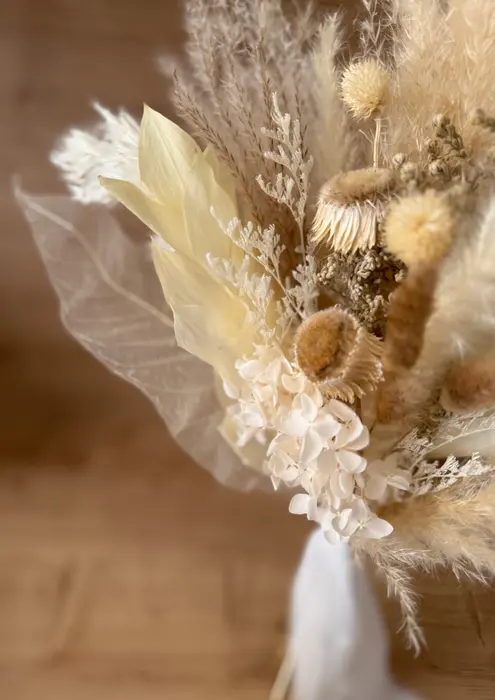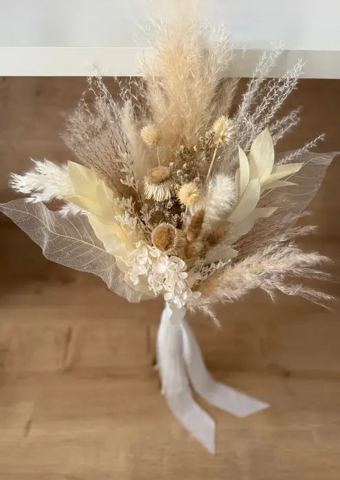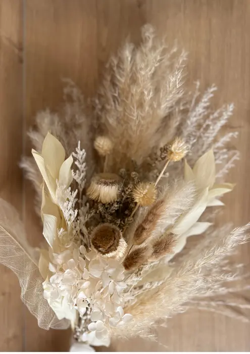 זר כלה טבעי המורכב מצמחים מיובשים ומשומרים באיכות הגבוהה ביותר, שנבחרו בקפידה אחד אחד.