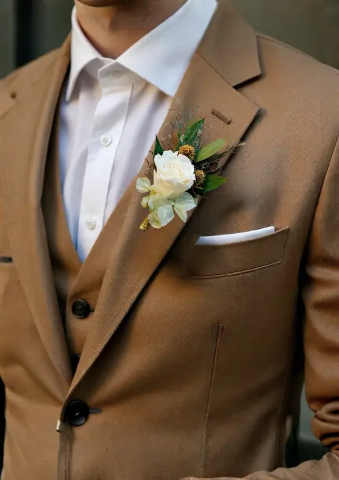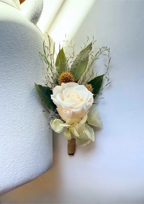 תכשיט אלגנטי לחליפה, המעוצב בעבודת יד מפרחים מיובשים/משומרים באיכות הגבוהה ביותר.