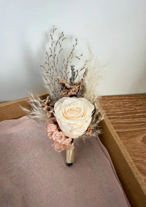 תכשיט אלגנטי לחליפה, המעוצב בעבודת יד מפרחים מיובשים/משומרים באיכות הגבוהה ביותר.