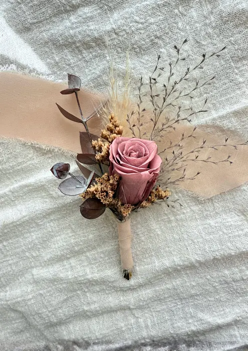 תכשיט אלגנטי לחליפה, המעוצב בעבודת יד מפרחים מיובשים/משומרים באיכות הגבוהה ביותר.