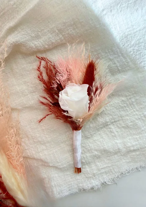 תכשיט אלגנטי לחליפה, המעוצב בעבודת יד מפרחים מיובשים/משומרים באיכות הגבוהה ביותר.